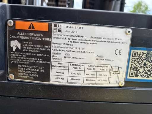 Carrello elevatore Hyster S7.0FT 2010; 7.000 kg di capacità di sollevamento; altezza di sollevamento 6.200 mm; motore a benzina a GPL/V6; 12.693 ore; sollevamento libero; albero in compensato; spostamento laterale; illuminazione anteriore e posteriore; peso 10.950 kg; Revisionata 100 ore fa; Si prega di notare: la visione su appuntamento tramite aanmelden@troostwijkauctions.com.