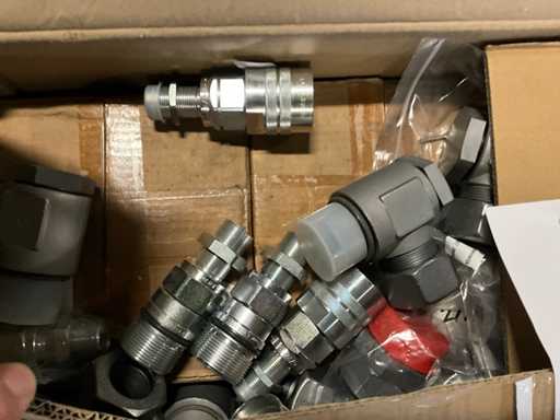 Diverse hydrauliek onderdelen, diverse 1/2" en 3/4" snelkoppelingen, filters, cilinders, geperste slangen 1250 mm, koppelingen en nippels, betreft een ongebruikte product, Let op! zonder pallets of palletranden,