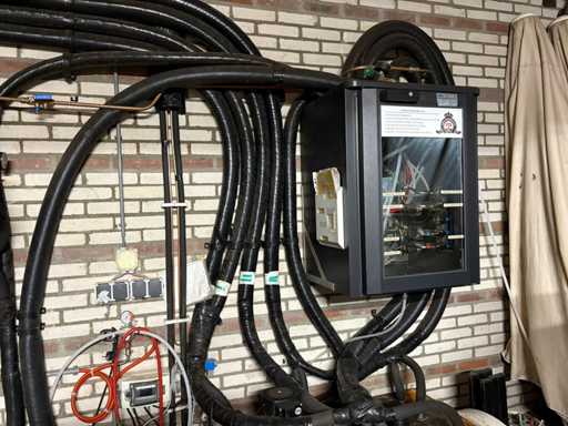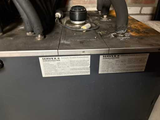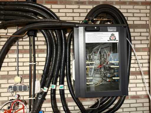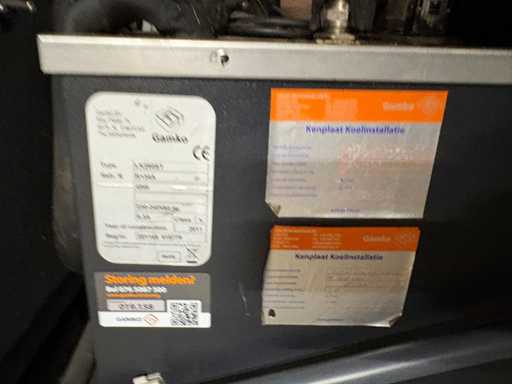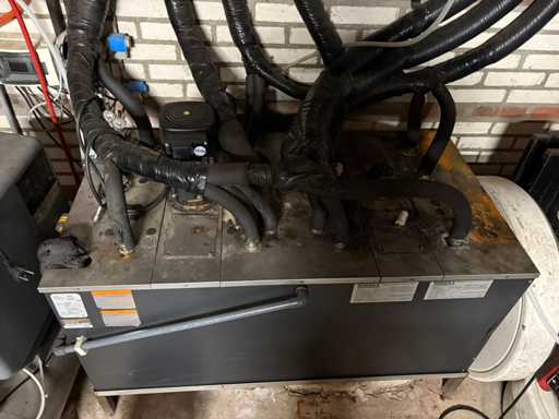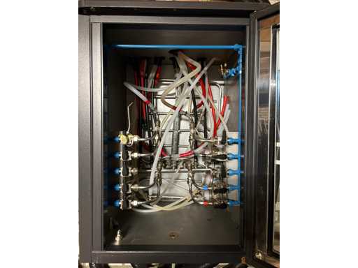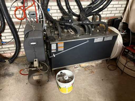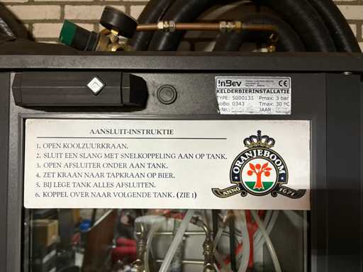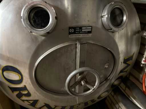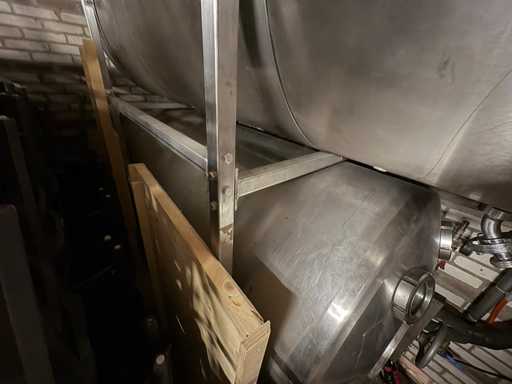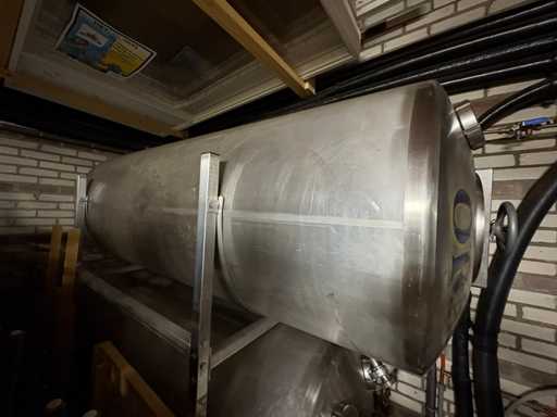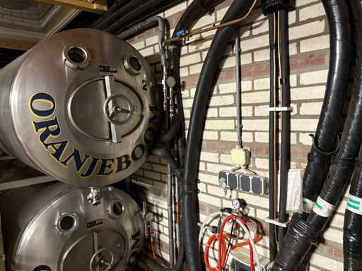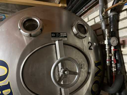 Serbatoi di stoccaggio della birra (1000 litri ciascuno) con impianto di raffreddamento dell'acqua e motori con scatola di distribuzione