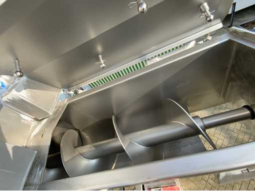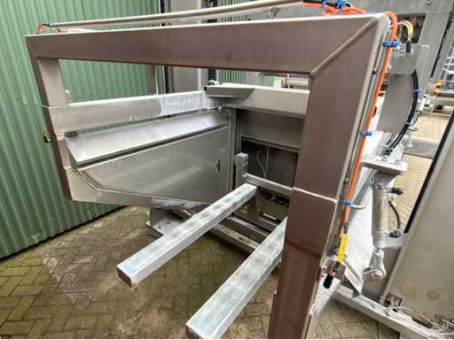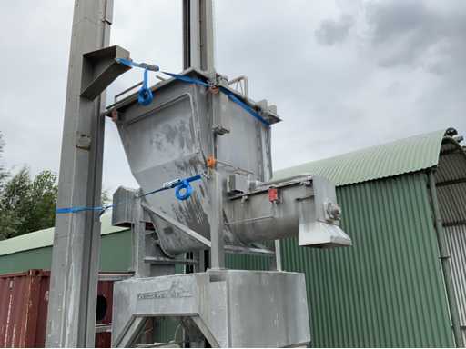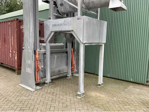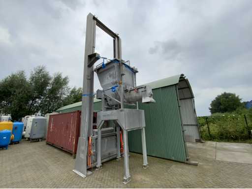 Installazione lift-tilt con tramoggia e nastro trasportatore a vite dosante. Altezza di installazione sollevatore-inclinazione: 8,20 m. Dimensioni dell'ingresso dell'installazione inclinabile: 110x120x175cm.