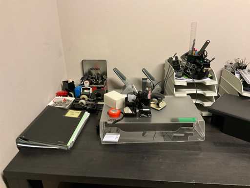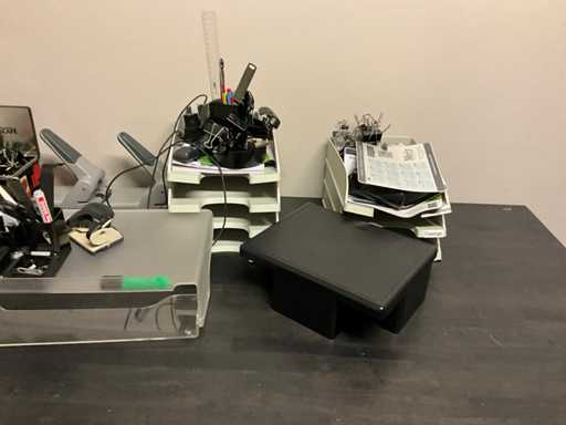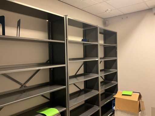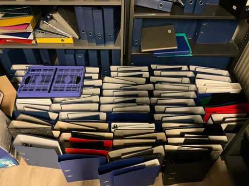 Inclusi un schedario Ahrend (1200x450x1950 mm) e 4 mensole in metallo (2250x400 mm), 1x tavolo da imballaggio, raccoglitori e forniture per ufficio
