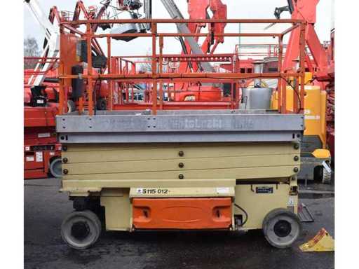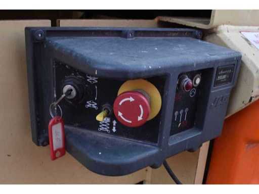 Interno n. 28590, altezza da terra 0,11 m, capacità di sollevamento in estensione 120 kg, posizione di trasporto in altezza senza ringhiera 1,45 m, pneumatici bianchi, punti di ancoraggio per sistemi di contenimento (DPI) disponibili. Nota: Batterie difettose, funzioni fornite,