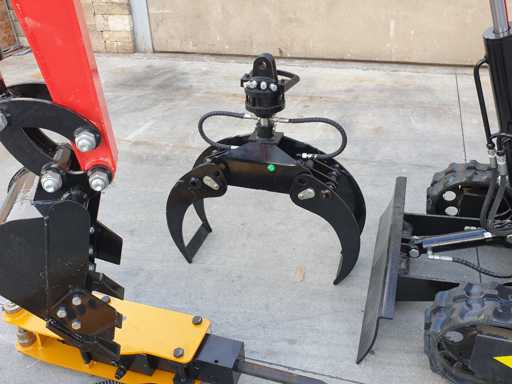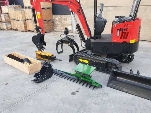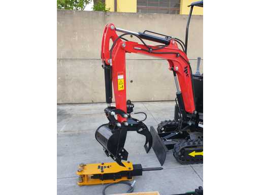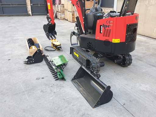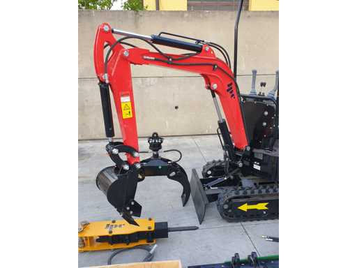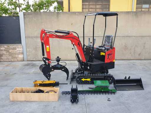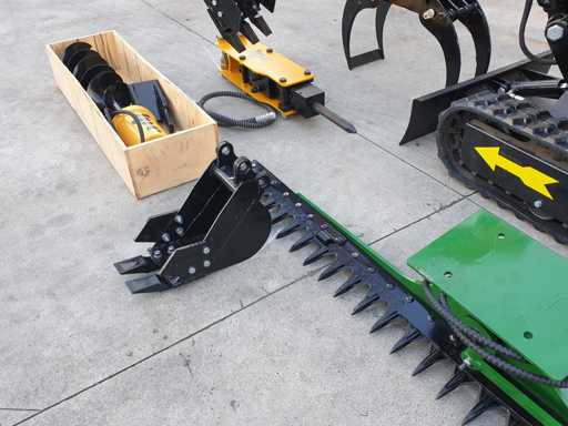 Miniescavatore cingolato, completo di benna da scavo, accensione elettronica, cingoli in gomma, ralla rotazione continua 360 gradi, attacco e comando per martellone, + accessori trivella universale 200mm, martellone idraulico, lama falciante, pinza per legna, benna 200mm + benna 800 mm . Mai usato 0 ore