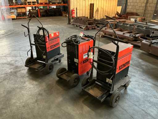 Consiste in: Set 3 macchine per saldare, 2 pezzi Kempi Kempak 200, compatta macchina per saldatura TIG DC (corrente continua), 5A - 200ampere ed è adatta a vari materiali come acciaio e acciaio inossidabile, con funzioni per saldatura MMA (elettrodo) e un ciclo di lavoro relativamente elevato (ad esempio 35% a 170A), 1 pezzo Kempi Kempotig AC/DC 250, sorgente compatta TIG/MMA (elettrodo) a doppia corrente, adatto sia per la saldatura AC (alluminio) che per la DC (acciaio, acciaio inossidabile), progettato per un uso impegnativo, con impostazioni predefinite per vari metodi, progettato per il collegamento a 400 V (trifase), corrente massima di saldatura di 250 A, ciclo di lavoro: 30% a 250 A, 60% a 180 A, 100% a 140 A, tutti i dispositivi in condizioni di funzionamento, montati su carrello robusto, dotato di manici e ruote.