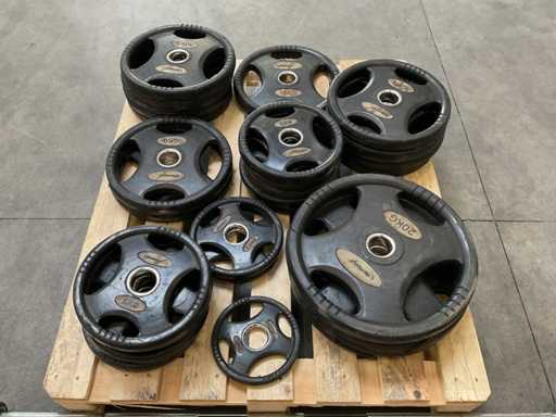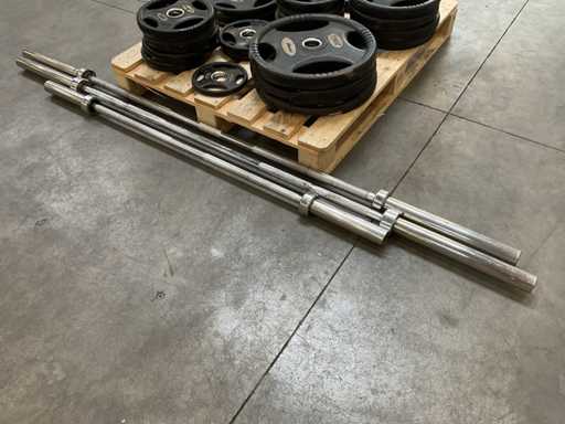 Composto da: 3x bilanciere con cuscinetto da 50 mm e 27 dischi da 50 mm (1x1,25 kg, 2x2,5 kg, 10x5 kg, 10x10 kg, 1x15 kg e 3x20 kg).