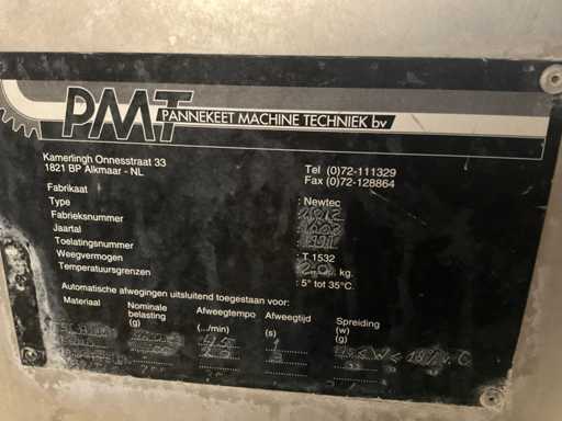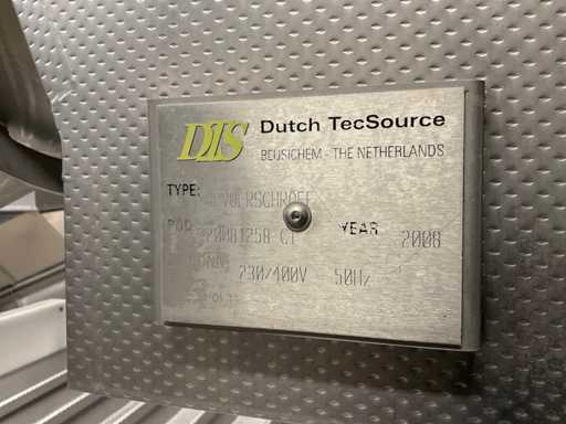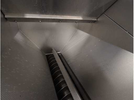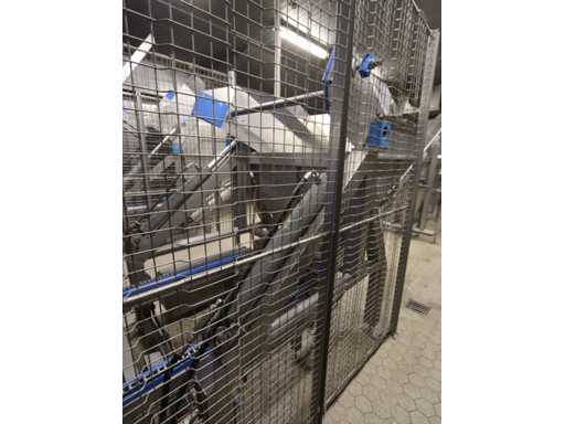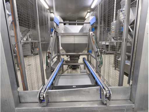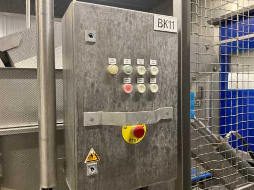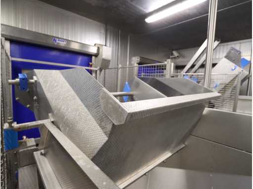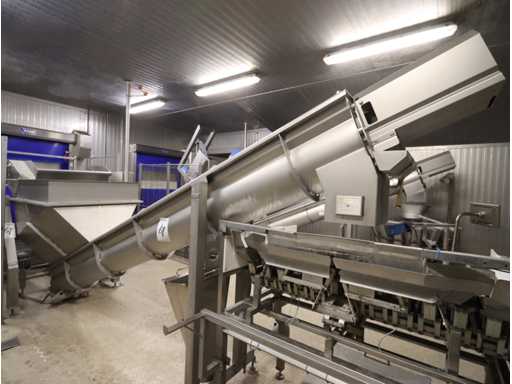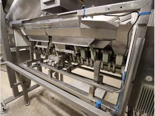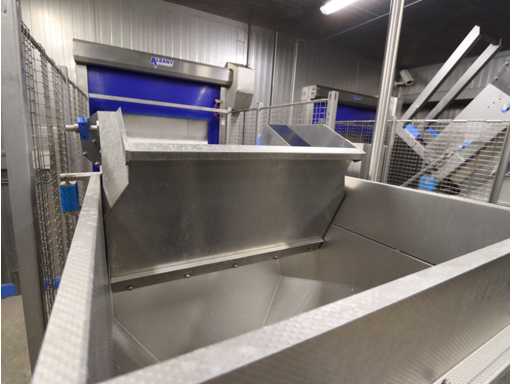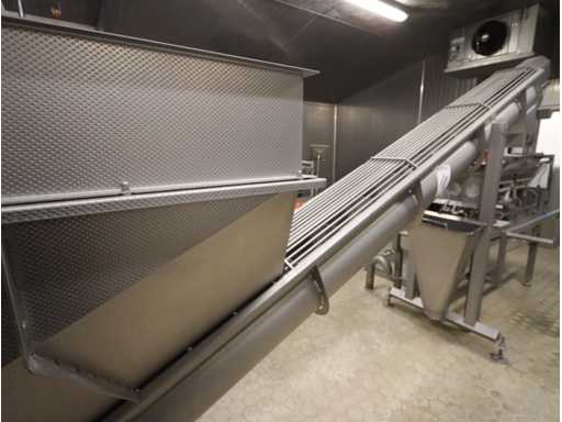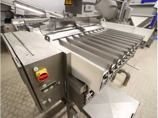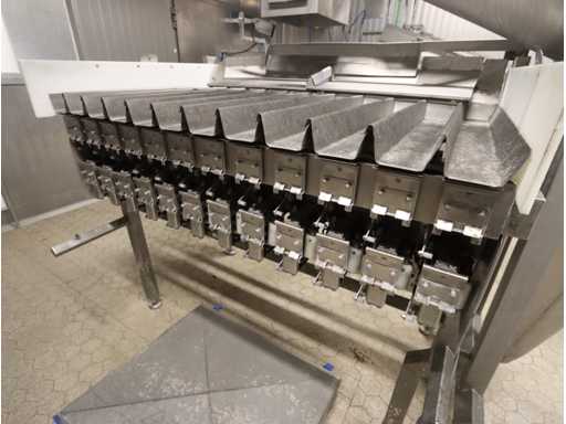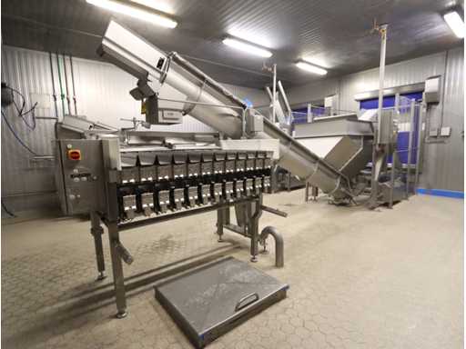 Composto da: bascchio con catena trasportante di alimentazione, larghezza del binario 850 mm, lunghezza 2000 mm, incluso nastro trasportatore a vite elevatore con tramoggia ricevente, vitezza Ø 400 mm, lunghezza della vite 4500 mm, altezza di uscita 1500 mm, bunker con apertura di alimentazione circa 1100x1300 mm, pesatura "Newtec", tipo 2012, 12 linee, intervallo massimo di pesatura 2000 grammi, passaggio a pavimento non incluso