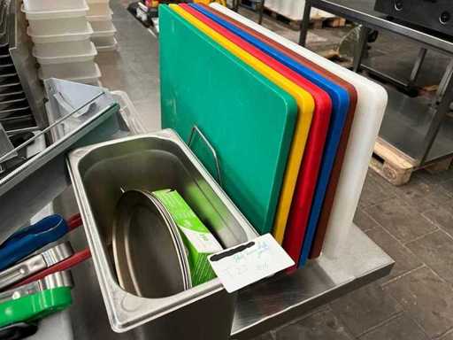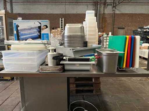 Nuovo e usato. Nota: il lotto contiene solo gli oggetti per catering/cucina/forniture. Senza tavolo da lavoro in acciaio inox.
