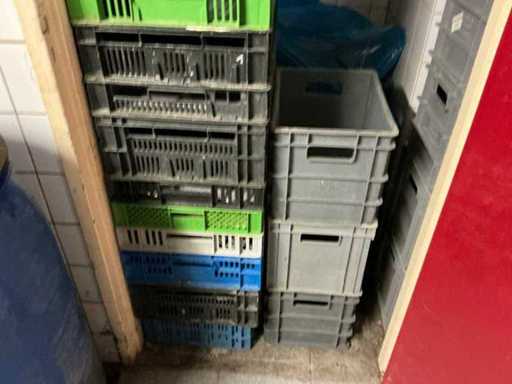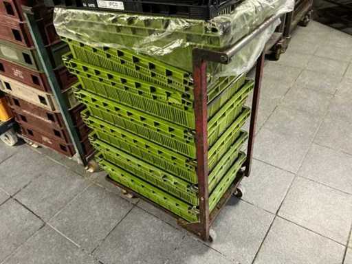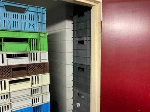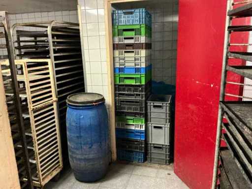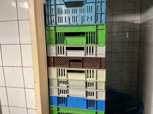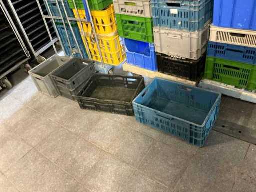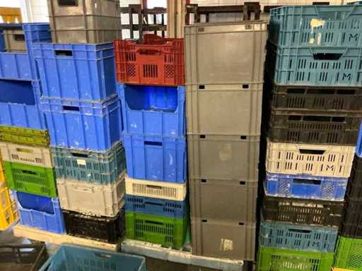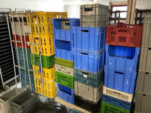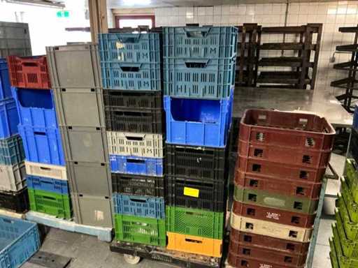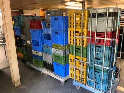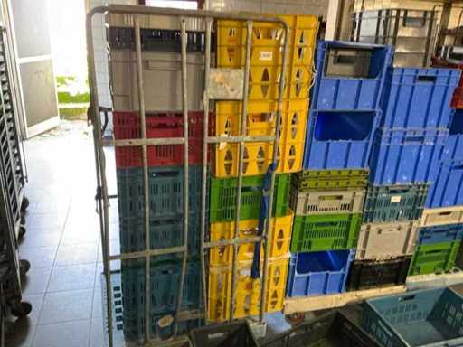 Circa 110 pezzi di vari modelli; Dimensioni e colori: parzialmente impilabili; parzialmente in cassa; con pochi carrelli da trasporto