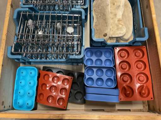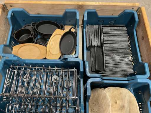 - o.a. siliconen vormen, leisteen amuse plateaus, warmhoud rekjes, tapasplanken, etc., incl. kunststof kratten.