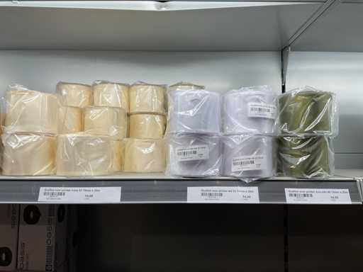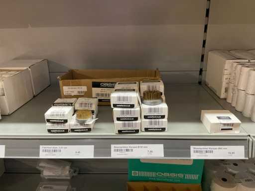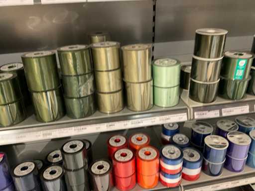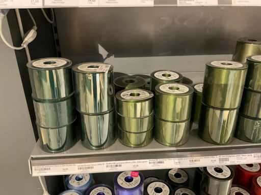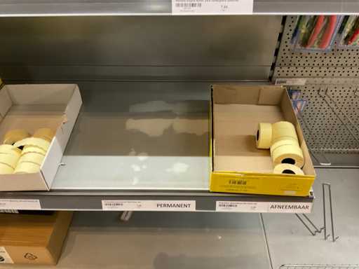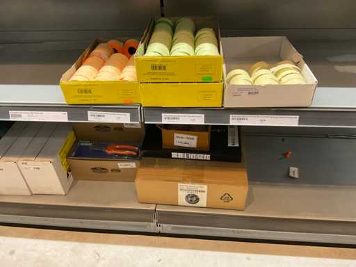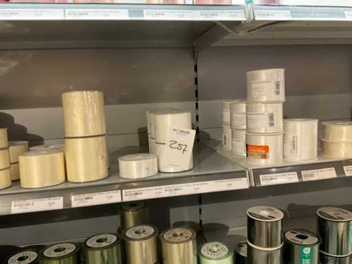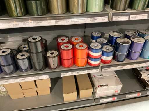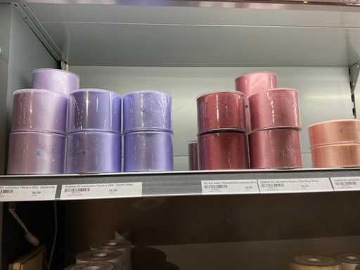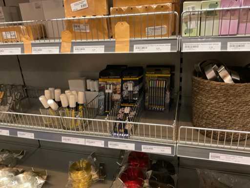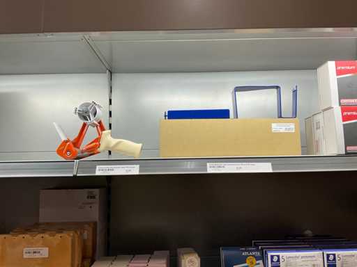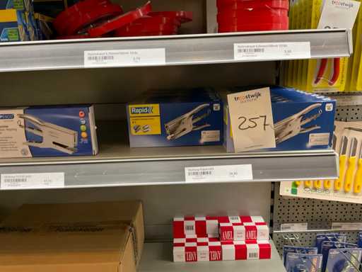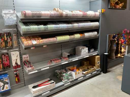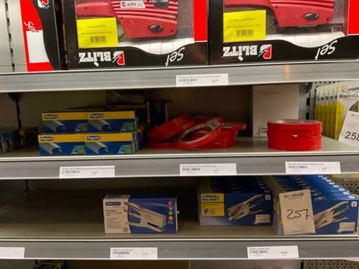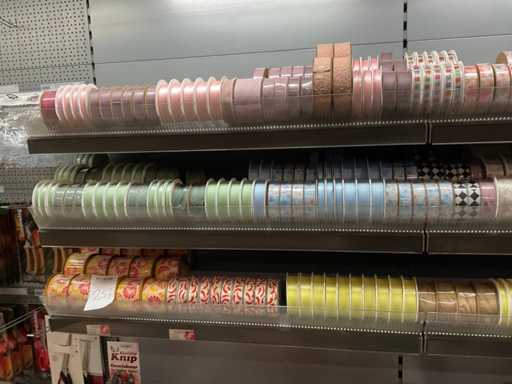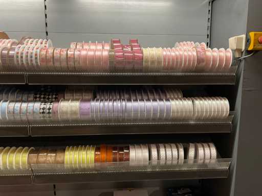 Contenuto della parte della rastrelliera costituito da nastro decorativo, cesoie da potatura, portarotoli per nastro adesivo, cucitrici, spilli, etichette, nastro da stampa, spille e pistole per prezzi escluso il rack