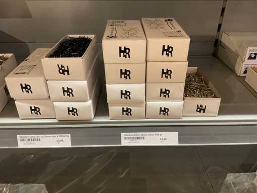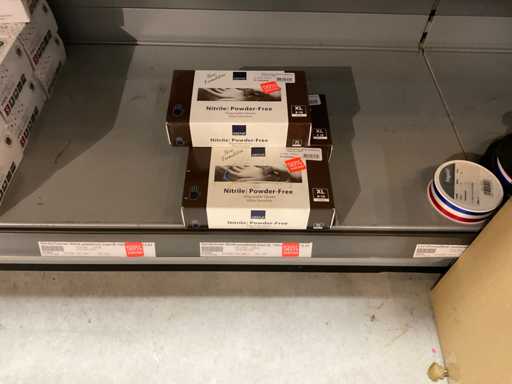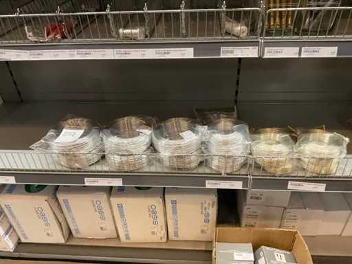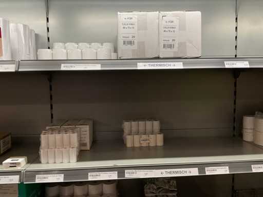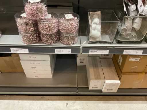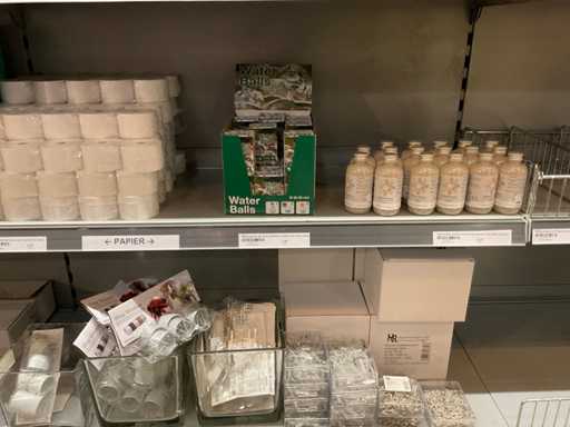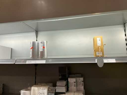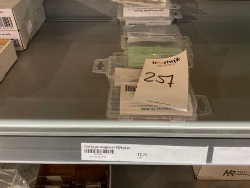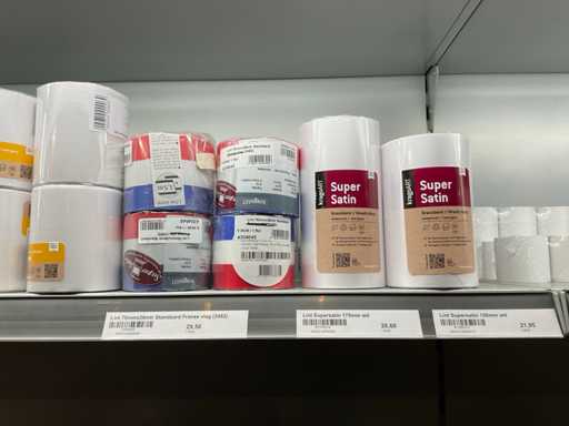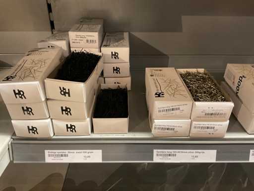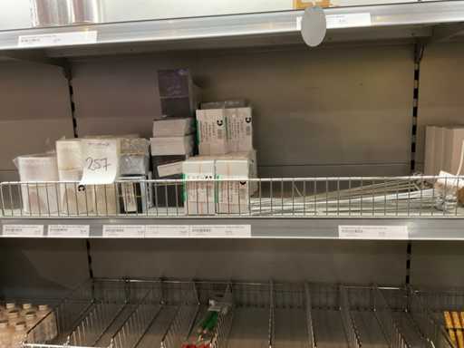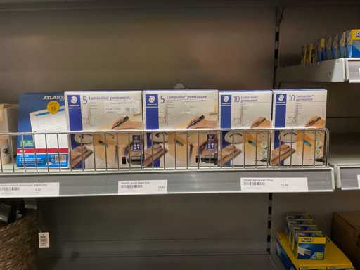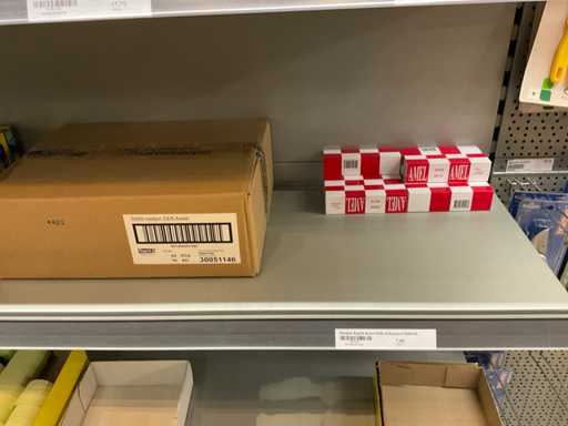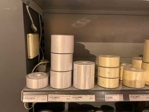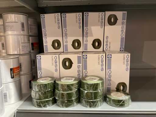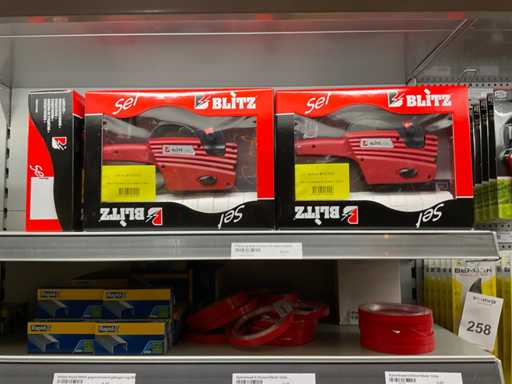 Contenuto della parte della rastrelliera costituito da nastro decorativo, cesoie da potatura, portarotoli per nastro adesivo, cucitrici, spilli, etichette, nastro da stampa, spille e pistole per prezzi escluso il rack