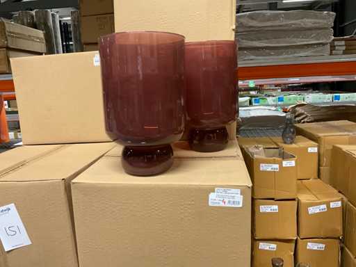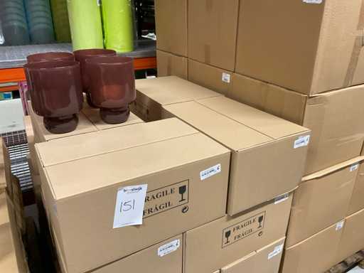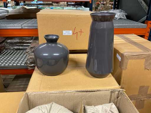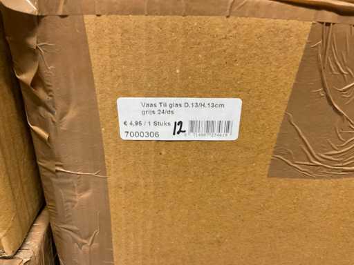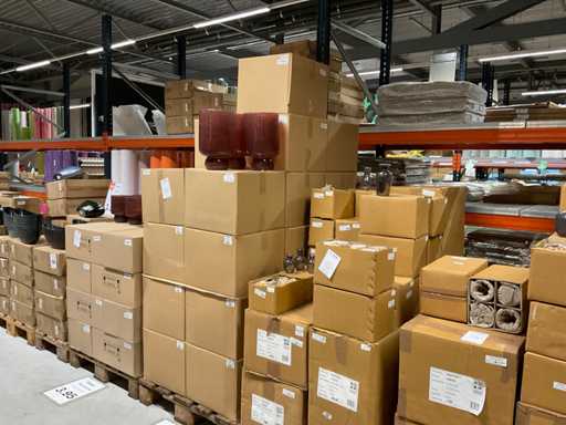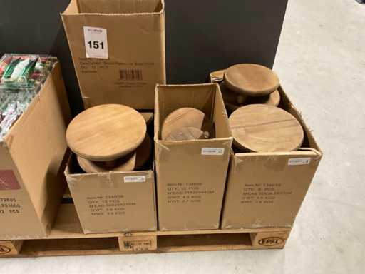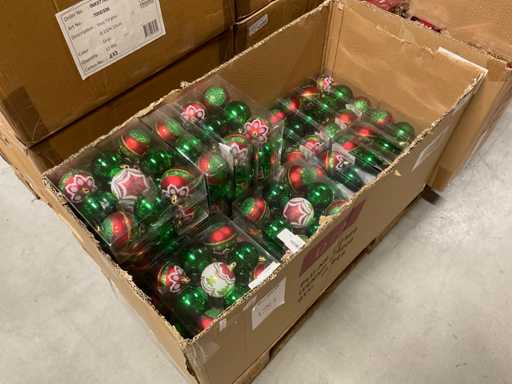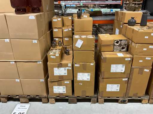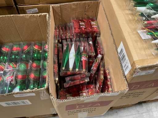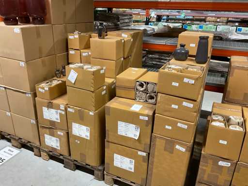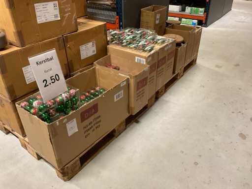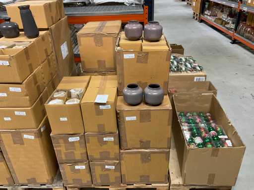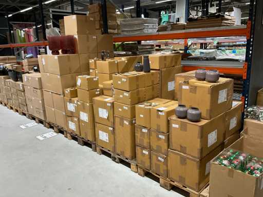 Contenuto su 7 pallet composti da vassoi di legno, vari vasi colorati e palle di Natale. Pallet compresi.