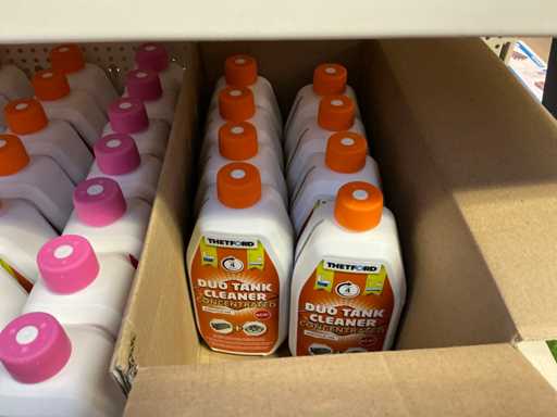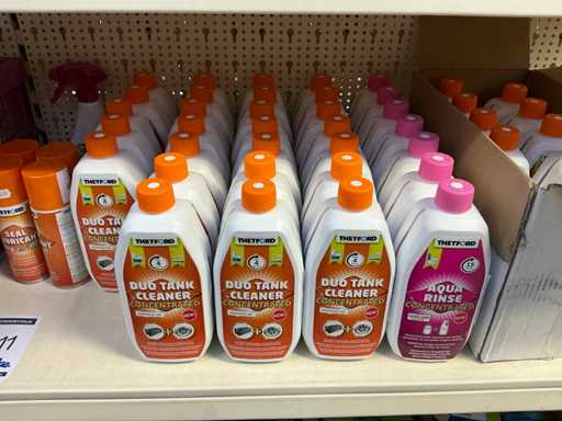 Circa 40 bottiglie di detergente per serbatoi grigi Thetford e un lotto di coperture per i sedili del WC