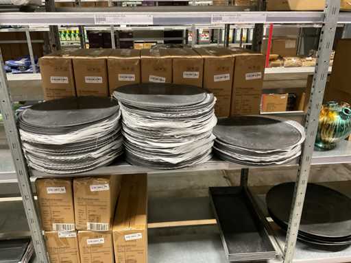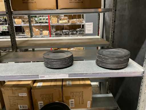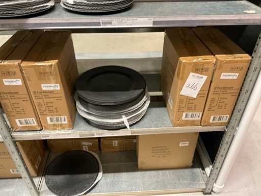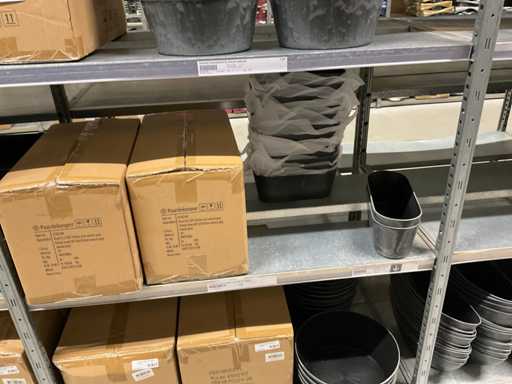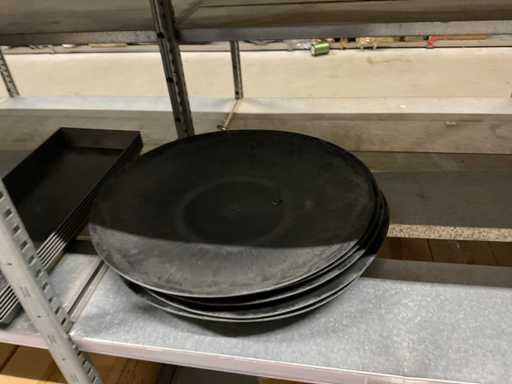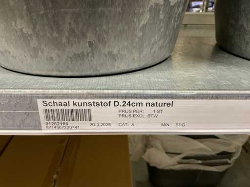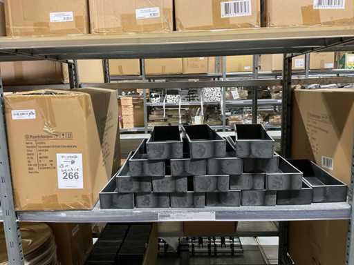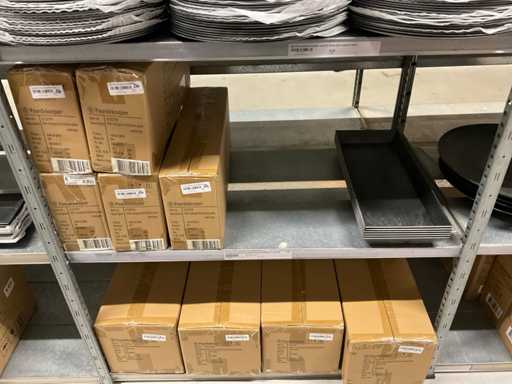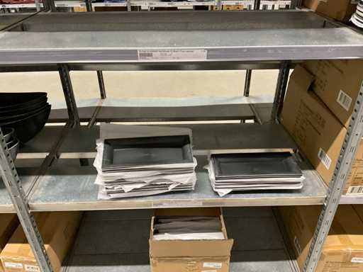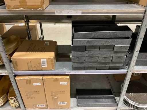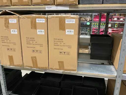 Contenuto di 8 sezioni di rack composto da diverse dimensioni e colori di ciotole e pentole in plastica.