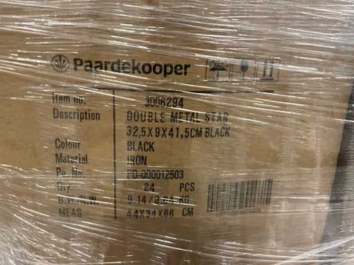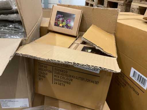 Pallet con vari tra cui sacchetti, stelle glitterate, pigne glitterate