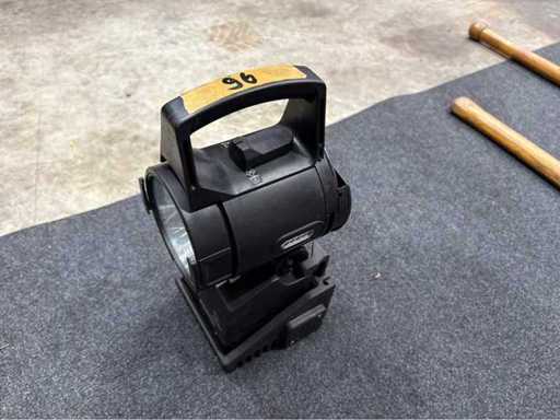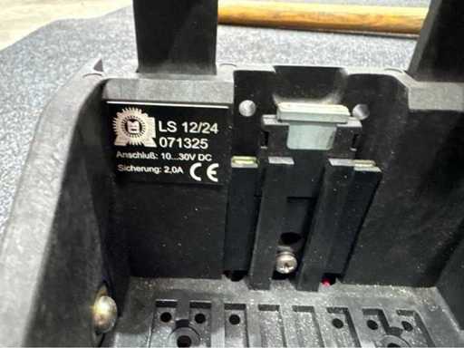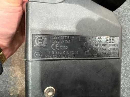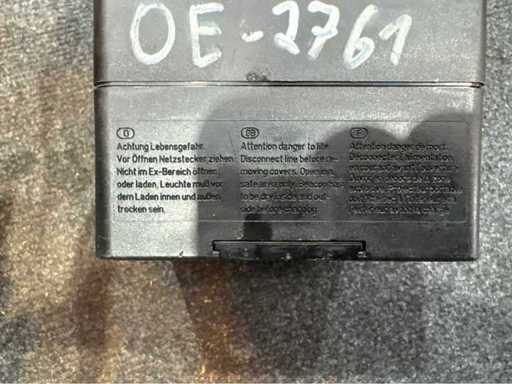 Lampada con maniglia di trasporto integrata, testata secondo la direttiva ATEX (PTB 02 ATEX 2003). Tipo di batteria: 4 × 7 Ah o 4 × 5 Ah, 4,8 V tensione di sistema. Staffa di carica LS 12/24 con intervallo di connessione 10–30 V DC, fusibile da 2 A. Sistema non controllato per il funzionamento, stato di ricarica sconosciuto.