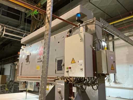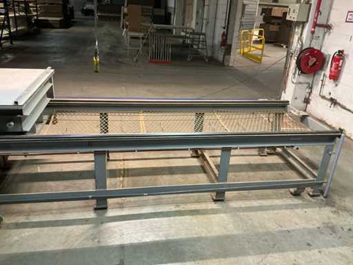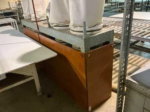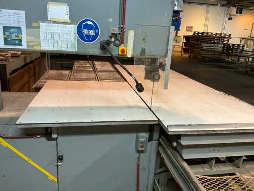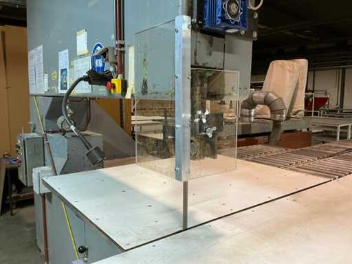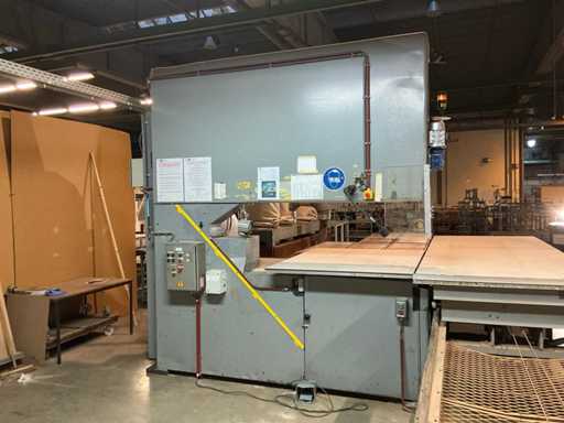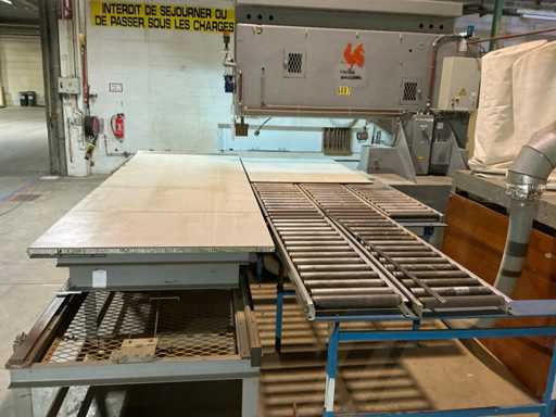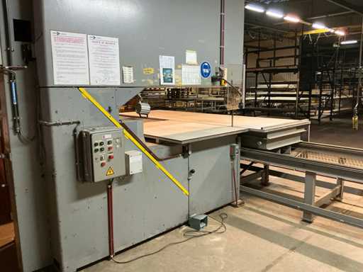 Tavolo di alimentazione su rotaia 3800x1300 mm; lunghezza della rotaia 7300 mm; nastro trasportatore a rulli di alimentazione 2650 mm; Max. Altezza di taglio 550 mm; con estrazione della polvere con 4 sacchi per la polvere