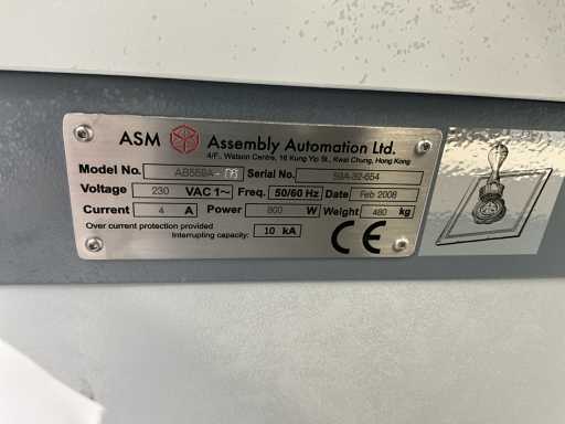 ASM AB 559A-06 è un wire tie ad alte prestazioni, controllato da microprocessore, progettato per la connessione multipunto di chip integrati su larga scala. Il dispositivo offre una gamma di caratteristiche e capacità che lo rendono adatto a una varietà di applicazioni di assemblaggio di chip microelettronici. Legatore a cuneo, testa di legame 60°, 10 bar (145 psi), Pressione fornita 5 bar (72,5 psi), Consumo d'aria 63 1/min (2,2 cfm), Classificazione: 15A-125V, 1875 Watt, SVT schermata con foil Beldfoil, AWG Stranding: 14 (41x30), Diametro 1,91 mm, 230 VAC (monofase) ± 5%, Frequenza 50/60 Hz, Consumo energetico 800 W
