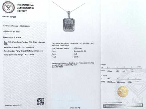 Magnifico Pendente di Lusso Diamante Naturale 3,72 carati in oro bianco 14 carati dal peso totale di 11,11 gr. con 241 diamanti rotondi naturali brillanti da 3,72 carati. Colore superiore e purezza D-E / VVS. Certificato da IGI Laboratoire, uno dei più grandi istituti internazionali per la certificazione e la valutazione di diamanti e pietre preziose. Per ulteriori informazioni, consulta il certificato. Il vero gioiello è meglio delle foto. Stima del prezzo del rivenditore: 12'950.- Nuovo gioiello.