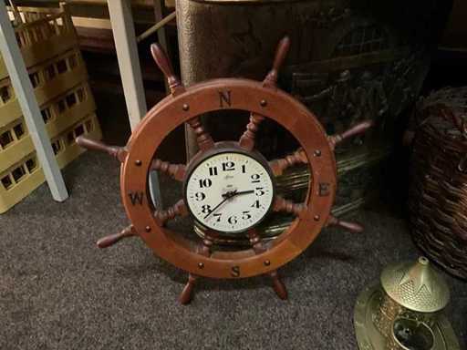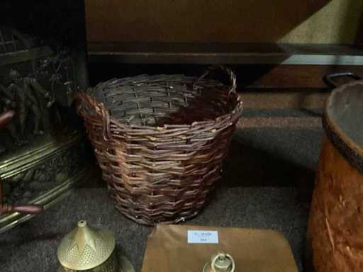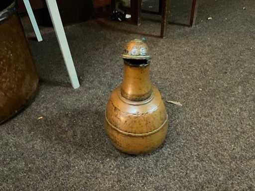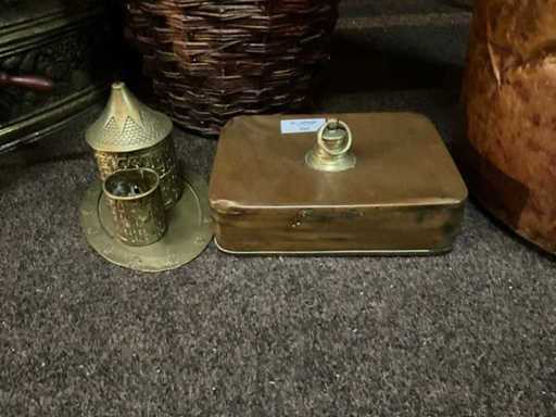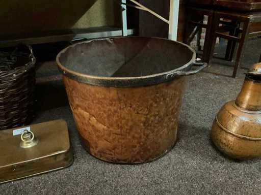 bollitori di rame, orologio, ciotola e cestino in ottone.