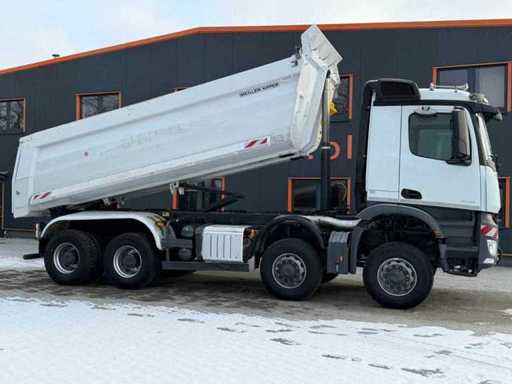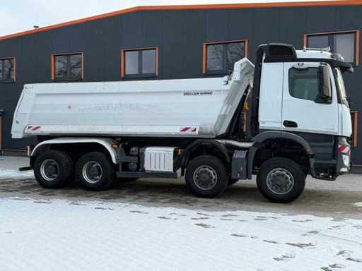 Molto potente Mercedes-Benz Arocs 4145 mulden tipper, equipaggiata in configurazione 8x8 completamente potente e robusta carrozzeria basciabile Meiller Mulden. Questo camion è progettato per un uso pesante in movimenti terra, edilizia e infrastrutture, dove la massima trazione e capacità di carico sono essenziali.