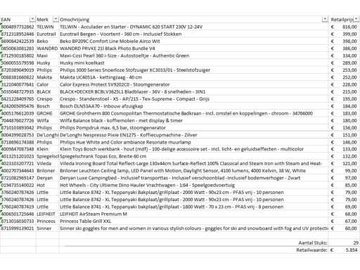 Si tratta di un lotto di prodotti resi a marchio A da un grande rivenditore online. Il lotto è composto da varie categorie di prodotti. Numero di pezzi: 29. Valore al dettaglio: €5854,- Non controllato: funzionamento sconosciuto (mix di
