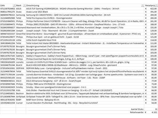 Si tratta di un lotto di prodotti resi a marchio A da un grande rivenditore online. Il lotto è composto da varie categorie di prodotti. Numero di pezzi: 31. Valore al dettaglio: €4102,- Non controllato: funzionamento sconosciuto (mix di