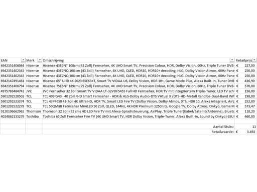 Si tratta di un lotto di televisori restituiti da un grande rivenditore online. Il gruppo è composto da televisori di varie dimensioni. Numero di pezzi: 11. Valore al dettaglio: €3492,- I televisori non funzionano e possono essere utilizzati per ricambi. Vieni il giorno della visione per farti un'idea del motivo del ritorno. Vedi le foto per l'elenco dei contenuti.