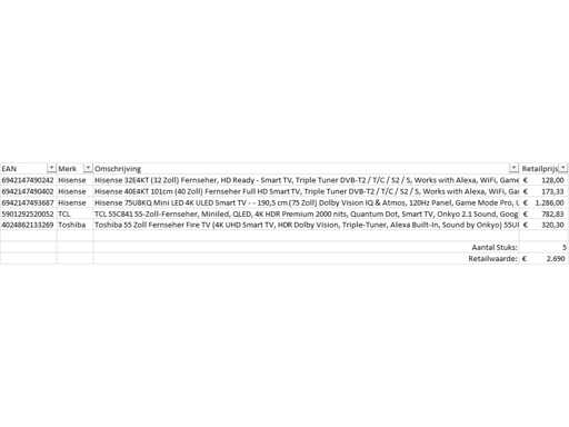 Si tratta di un lotto di televisori restituiti da un grande rivenditore online. Il gruppo è composto da televisori di varie dimensioni. Numero di pezzi: 5. Valore al dettaglio: €2690,- I televisori non funzionano e possono essere utilizzati come pezzi di ricambio. Vieni il giorno della visione per farti un'idea del motivo del ritorno. Vedi le foto per l'elenco dei contenuti.