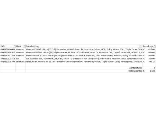 Si tratta di un lotto di televisori restituiti da un grande rivenditore online. Il gruppo è composto da televisori di varie dimensioni. Numero di pezzi: 5. Valore al dettaglio: €2699,- I televisori non funzionano e possono essere utilizzati come pezzi di ricambio. Vieni il giorno della visione per farti un'idea del motivo del ritorno. Vedi le foto per l'elenco dei contenuti.
