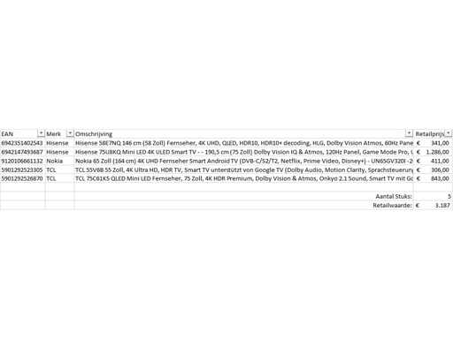 Si tratta di un lotto di televisori restituiti da un grande rivenditore online. Il gruppo è composto da televisori di varie dimensioni. Numero di pezzi: 5. Valore al dettaglio: €3187,- I televisori non funzionano e possono essere utilizzati per ricambi. Vieni il giorno della visione per farti un'idea del motivo del ritorno. Vedi le foto per l'elenco dei contenuti.