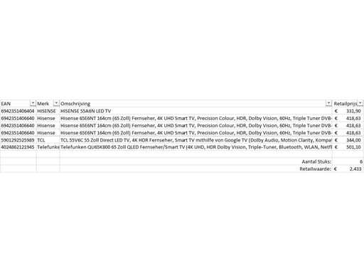 Si tratta di un lotto di televisori restituiti da un grande rivenditore online. Il gruppo è composto da televisori di varie dimensioni. Numero di pezzi: 6. Valore al dettaglio: €2433,- I televisori non funzionano e possono essere utilizzati per i ricambi. Vieni il giorno della visione per farti un'idea del motivo del ritorno. Vedi le foto per l'elenco dei contenuti.