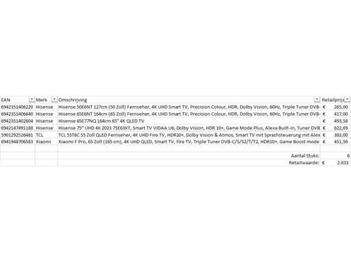 Si tratta di un lotto di televisori restituiti da un grande rivenditore online. Il gruppo è composto da televisori di varie dimensioni. Numero di pezzi: 6. Valore al dettaglio: €2633,- I televisori non funzionano e possono essere utilizzati come pezzi di ricambio. Vieni il giorno della visione per farti un'idea del motivo del ritorno. Vedi le foto per l'elenco dei contenuti.