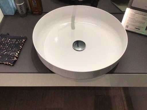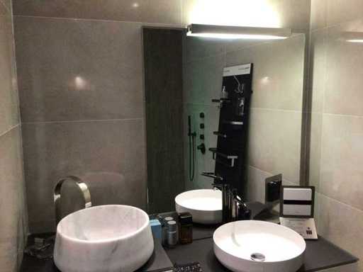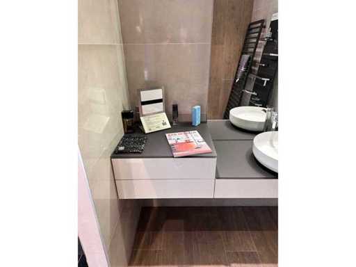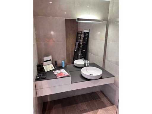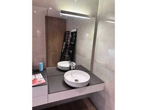 Mostra modello con il piano superiore del lavabo in vetro grigio-marrone opaco 100x52,5 cm con lavabo da piano lavoro 45x11,5 cm (acciaio smaltato) e 1 cassettone bianco lucido a spinta aperto. Il mobile base con 2 cassetti si apriva 60x52,5x31,2 cm e il piano era di vetro grigio marrone smerigliato. Specchio 100x120 cm con illuminazione fluorescente montata in superficie.