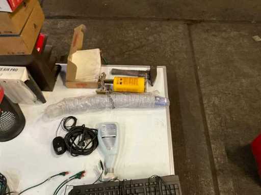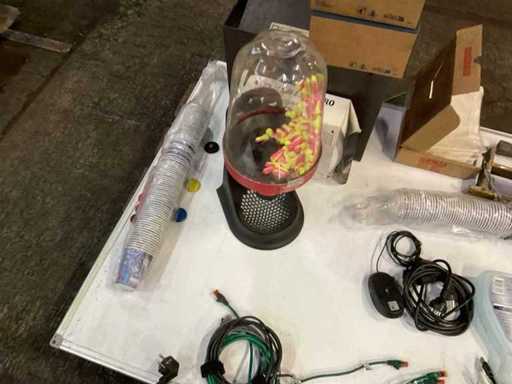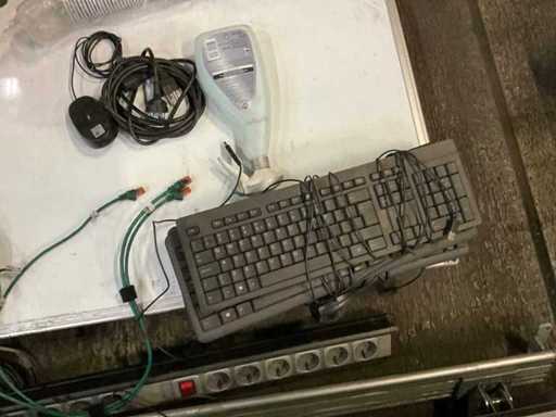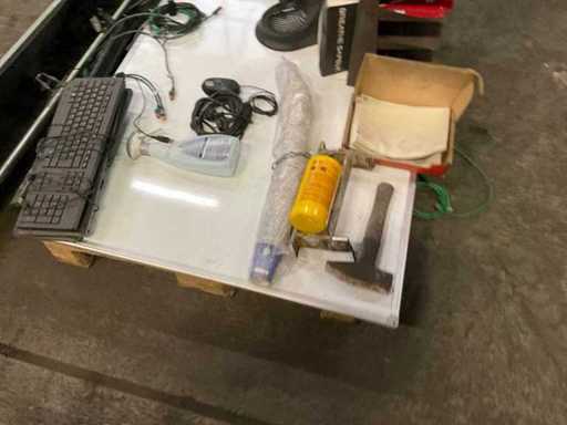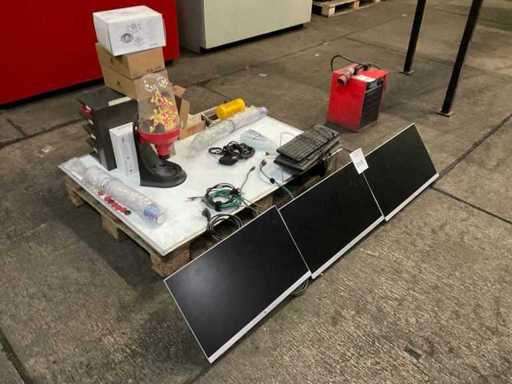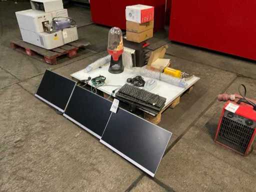 3 monitor su staffe dritte, inclusi vari materiali per ufficio, tra cui Lavagna, tastiere, mouse per computer, ecc