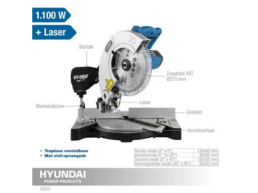 Con funzione laser! • Inclusa la lama della sega 48T • Con sacco per la raccolta della polvere • Modificabile all'infinito - Modello: 56251 - EAN: 8718502562514 - Connessione: 230 V / 50 Hz: - Potenza: 1.100 W - Lunghezza corda: 2 m - Nessuna velocità di carico: 5.500 giri/min - Diametro della lama della sega: 210 mm - Foratura dell'asse: 30 mm - Capacità di taglio: 45° in linea dritta 80 x 60 mm - Capacità di taglio: 90° rettilineo 120 x 60 mm - Angolo di rotazione: 45 / -45° - Smusso: 0-45° - Funzione laser: Sì - Livello di rumore: 107,78 dB(A) @7m - Peso: 6 kg Cosa c'è nella scatola: - Sega a braccio radiale radicale Hyundai con funzione di guida laser - Lama per sega TCT 48T da 210 mm per legno - Guida laterale - Morsetto per materiale -Brugola - Sacchetto per la polvere -Manuale ;