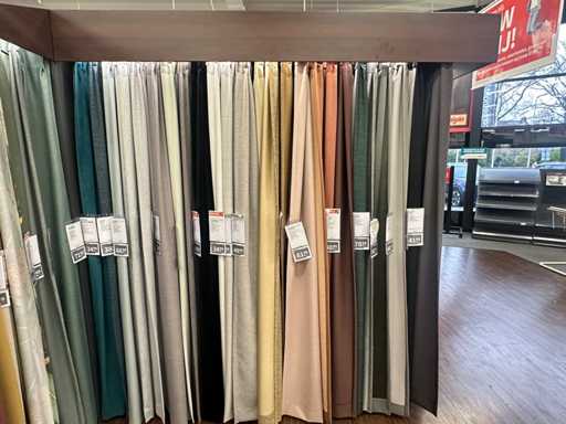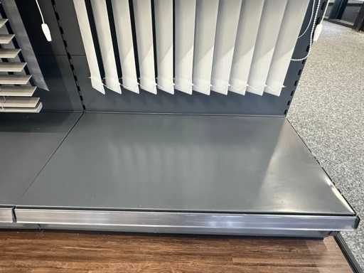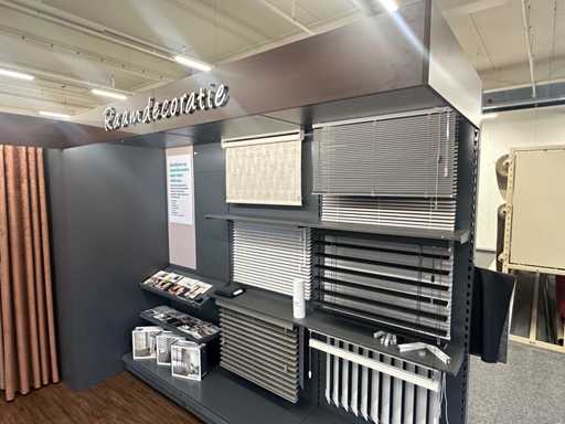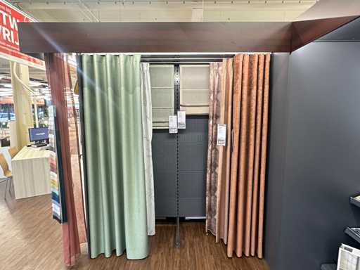 Questo muro è composto da 12 parti di 1 metro. Le parti possono essere smontate. Dotato di illuminazione LED. Include modelli demo e campioni di tende.