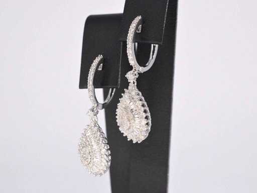 diamanti Diamante: naturale; Taglio: Brillante e taglio baguette; Peso (carati): 1,50 carati; Colore: F-G; Purezza: SI-P; Qualità del taglio: Molto buona; Gioiello: Orecchini; Peso: 5,5 once; Dimensioni/lunghezza: 30 mm; Materiale: 14 carati (585); Condizione: Nuova; Imballaggio: scatola di gioielli di lusso; Spiegazione: La qualità è stata presa dal rapporto relativo all'articolo. La valutazione è una valutazione di un commerciante certificato di diamanti, basata sui prezzi al consumatore; Prezzo al consumo: € 6.545