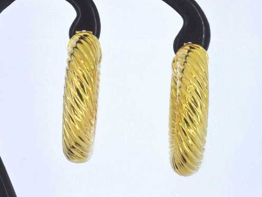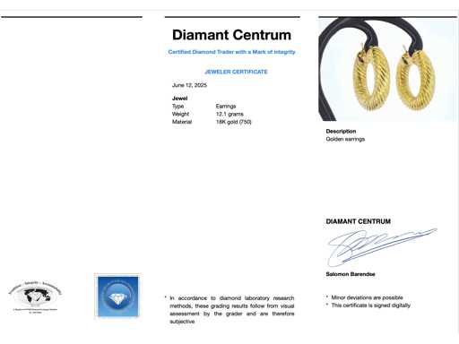 dati Orecchini d'oro Gioiello: Orecchini; Peso: 12,1 grammi; Dimensioni/lunghezza: 3,5 cm (diametro); Materiale: oro 18K (750); Condizione: Come nuova; Imballaggio: scatola di gioielli di lusso; Spiegazione: La qualità è stata presa dal rapporto relativo all'articolo. La valutazione è una valutazione di un commerciante certificato di diamanti, basata sui prezzi al consumatore; Prezzo al consumo: € 7.875