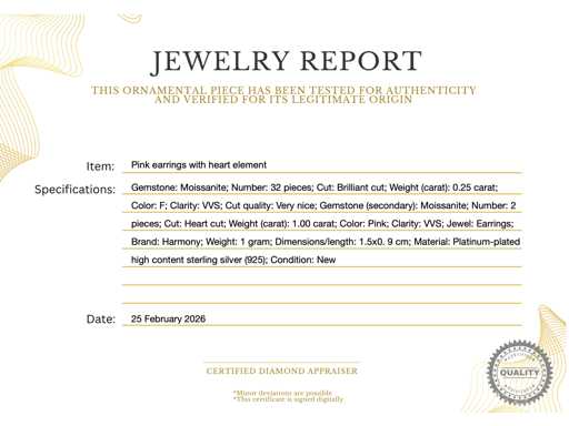 cuore Gemma: Moissanite; Quantità: 32 pezzi; Taglio: Taglio brillante; Peso (carati): 0,25 carati; Colore: F; Purezza: VVS; Qualità del taglio: Molto buona; Gemma (secondaria): Moissanite; Quantità: 2 pezzi; Taglio: taglio al cuore; Peso (carato): 1,00 carati; Colore: Rosa; Purezza: VVS; Gioiello: Orecchini; Marchio: Harmony; Peso: 1 grammo; Dimensioni/lunghezza: 1,5x0,9 cm; Materiale: Argento sterling di alta qualità platino (925); Condizione: Nuova; Imballaggio: scatola per gioielli o custodia di velluto; Spiegazione: La qualità è stata presa dal rapporto relativo all'articolo. La valutazione è una valutazione di un commerciante certificato di diamanti, basata sui prezzi al consumatore; Informazioni aggiuntive: Elemento decorativo visibile.; Prezzo al consumo: € 1.200