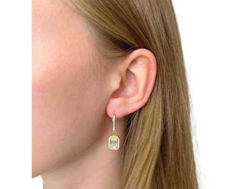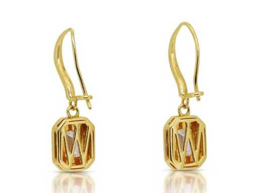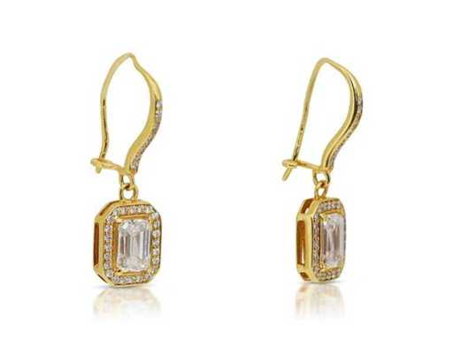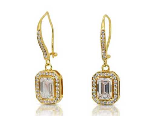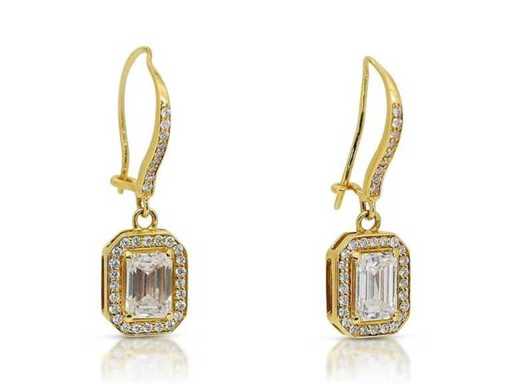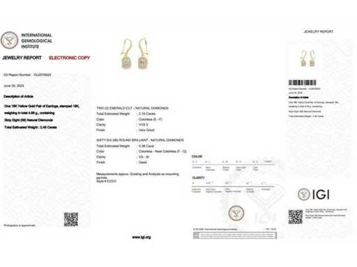 Orecchino di lusso Diamante Naturale 2,48 carati in oro giallo 18k, peso totale 4,68 gr., con due diamanti naturali centrali tagliati smeraldo E-F / VVS2 da 2,10 carati con 66 diamanti naturali rotondi brillanti F-G / VS a SI di 0,38 carati. Certificato dall'IGI Laboratoire, uno dei più grandi istituti internazionali per la certificazione e valutazione di diamanti e pietre preziose. Per maggiori informazioni, vedi il certificato. I gioielli, in realtà, sono meglio delle foto. Prezzo stimato del rivenditore: € 33.990.-