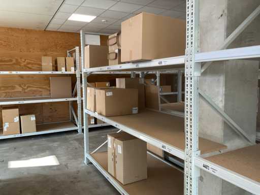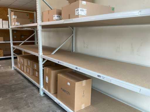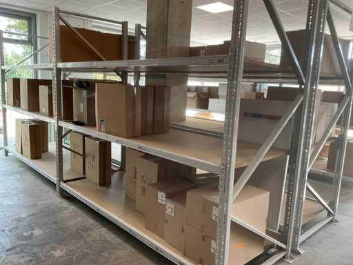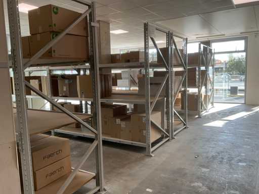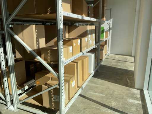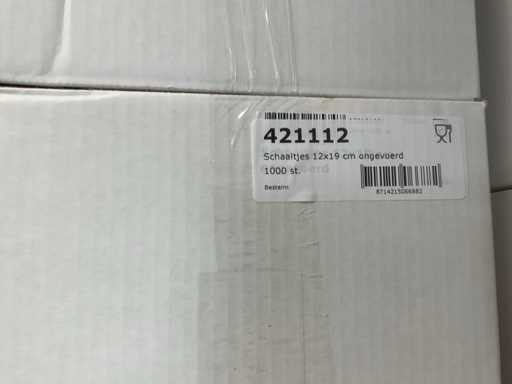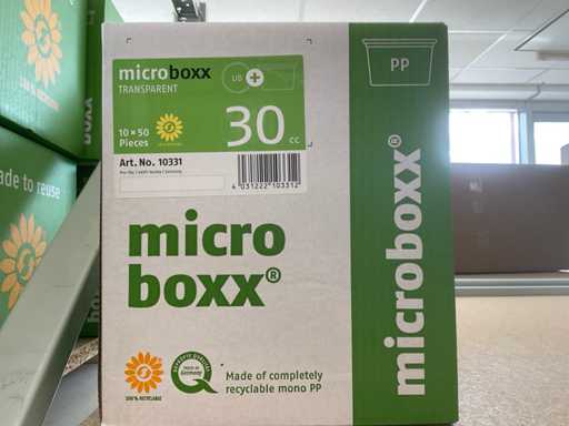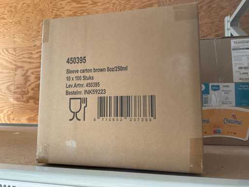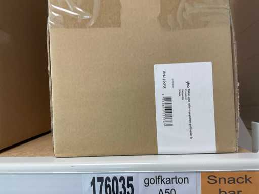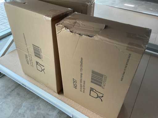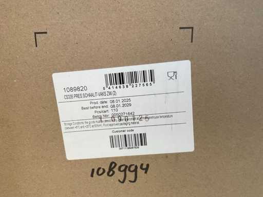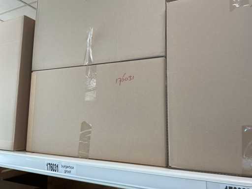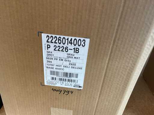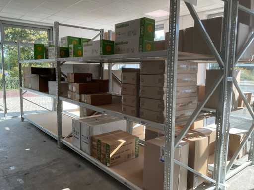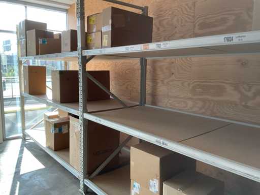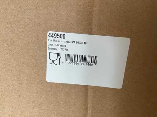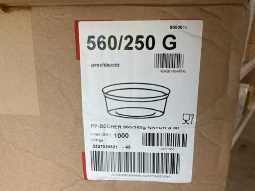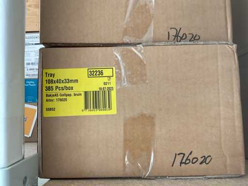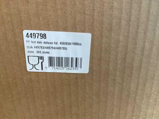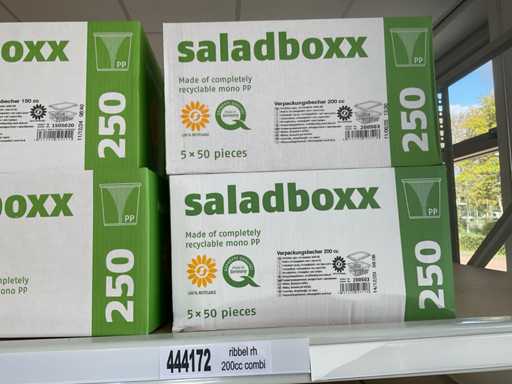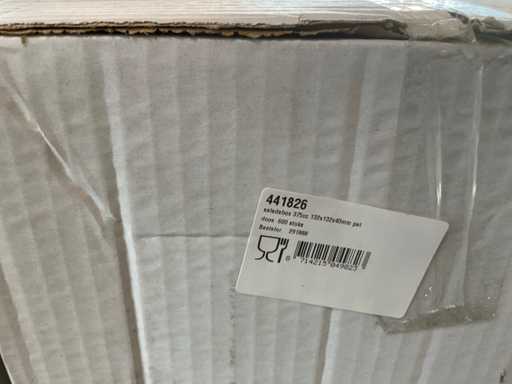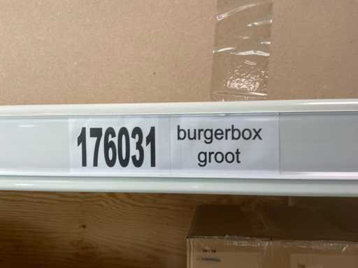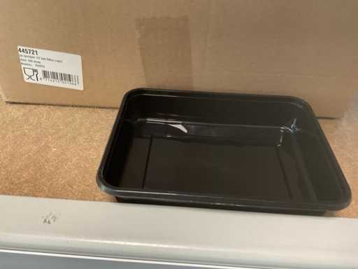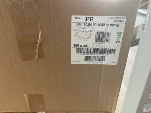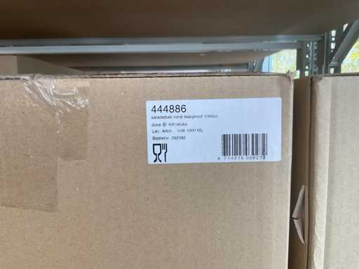 Contenuto dello scaffale composto tra l'altro da ciotole per pasti, coperchi, ciotole per carne, ciotole, tazze da minestra, contenitori per pasti, tazze, scatole per patatine, scatole per catering, piatti di presentazione, ciotole in alluminio, scatole per insalata, contenitori e coperchi riutilizzabili, ecc., esclusi gli scaffali