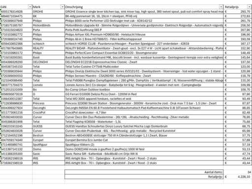 Si tratta di un lotto di prodotti restituiti di marca A da un grande rivenditore online. Il lotto è composto da varie categorie di prodotti. Numero di pezzi: 34. Valore al dettaglio: €4226,- Non controllato: operazione sconosciuta (mix di