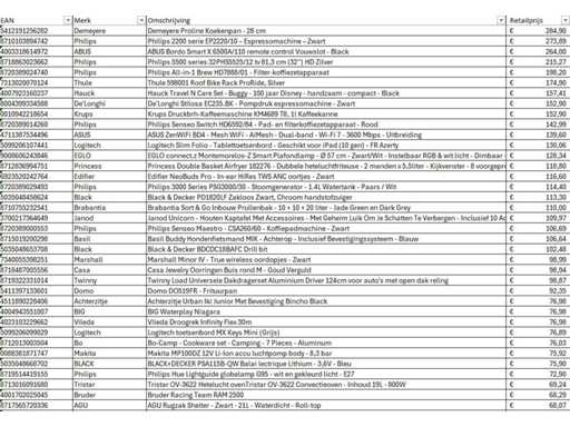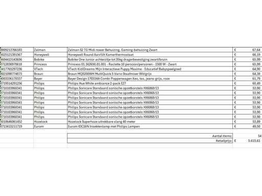 Si tratta di un lotto di prodotti restituiti di marca A da un grande rivenditore online. Il lotto è composto da varie categorie di prodotti. Numero di pezzi: 54. Valore al dettaglio: €5616,- Non verificato: operazione sconosciuta (mix di