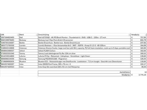 Si tratta di un lotto di prodotti restituiti di marca A da un grande rivenditore online. Il lotto è composto da varie categorie di prodotti. Numero di pezzi: 12. Valore al dettaglio: €2775,- Non controllato: operazione sconosciuta (mix di