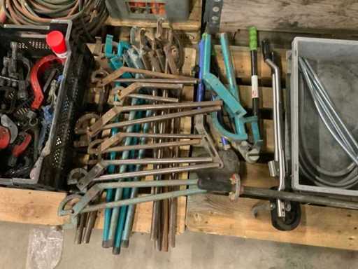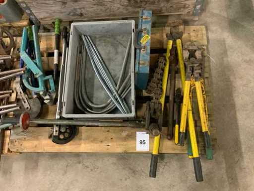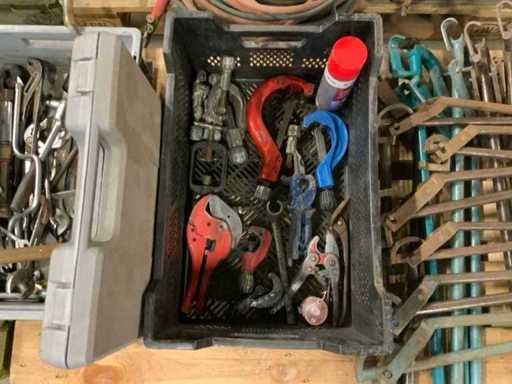 Tra cui: 3 strumenti per crimparsi, 14 piegature, 1 secchio con molle di prolunga, tronchetti, cesoie per tubi in plastica, chiavi ad anello, cacciaviti, 2 scatole di dischi da taglio RIDGID.