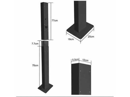 Questo palo di montaggio nero opaco è per tutte e solo le stazioni di ricarica Besen, sia con filo che con presa. Facile da montare su un calcestruzzo o su una grande piastrella. Dotato di fori pre-forati per 1 caricatore Besen EV, 1 portacavi di lusso e fondazione. Lunga 149 cm e una base di 19 x 25 cm. Pesa solo 8 kg ed è composto da 2 parti. Diverse prese in basso.