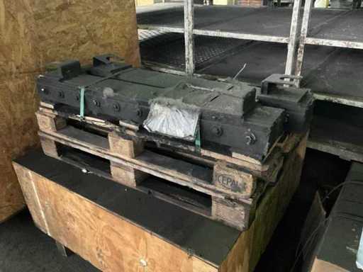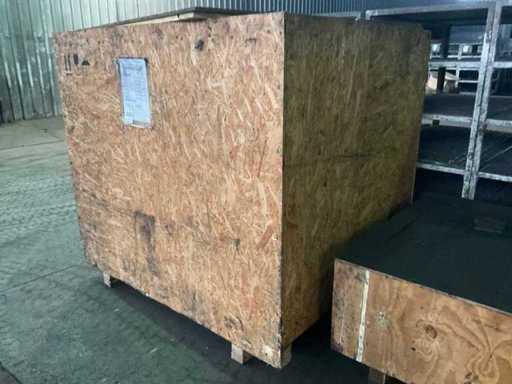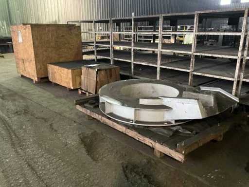 Varie parti di forno su pallet e scatole, inclusi stampi, testine di malifeta, cavi e coil, dentro e su 4 pallet box, incluse le pallet box.