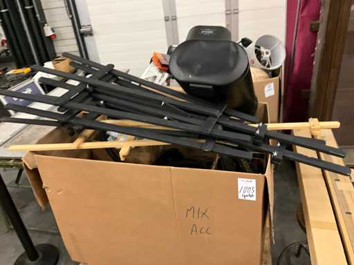 Composto da 4 cavalletti, varie luci, 2 bidoni della spazzatura, armadietto, portacappotti