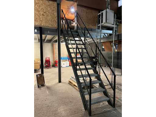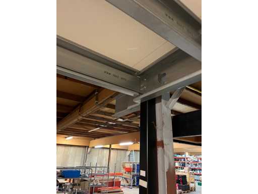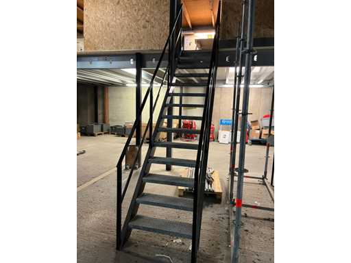 Questo soppalco è una robusta struttura in acciaio che offre spazio extra negli ambienti industriali. Il pavimento è composto da travi e colonne d'acciaio, dotato di un passaggio e di una scala di accesso sicura. Ideale per creare spazio aggiuntivo di stoccaggio, zone di lavoro o configurazioni di macchine senza espandere l'edificio.